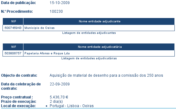Os ajustes directos adjudicados pelo Município de Oeiras nas comemorações dos seus 250 anos em 2009 ascendem a 4.697.242,81€
